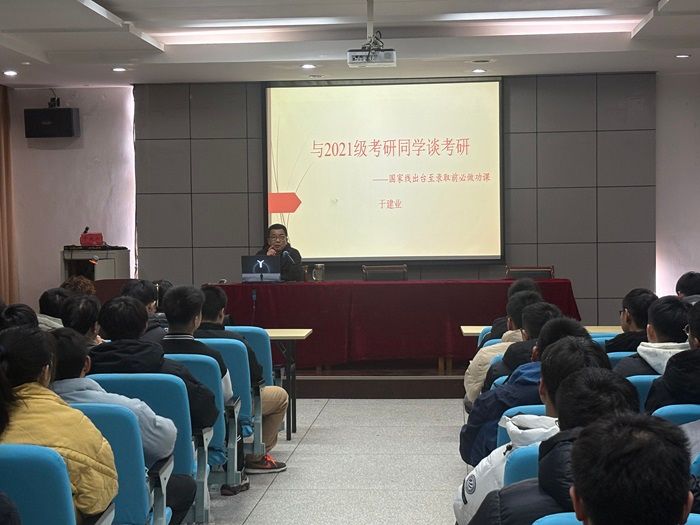 于建业对所有初试上线的同学表示祝贺,并结合多年来指导学生考研复试的经验,以《与2021级考研同学“三谈”考研——国家线出台至录取前必做功课》为题,就如何高效准备复试提出了宝贵的指导意见。他向同学们详细介绍了面试技巧、择校方法、平台获取信息等内容,并鼓励参加复试、调剂的同学们要找到适合自己的备考方法。