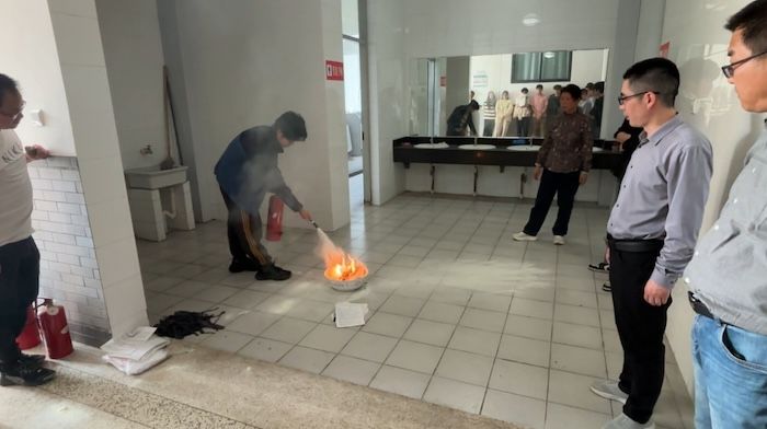 在空地处设置模拟火源点,夏菽兰、许志华等老师现场示范干粉灭火器“提、拔、握、压”四步操作口诀,并指导学生进行实战演练。